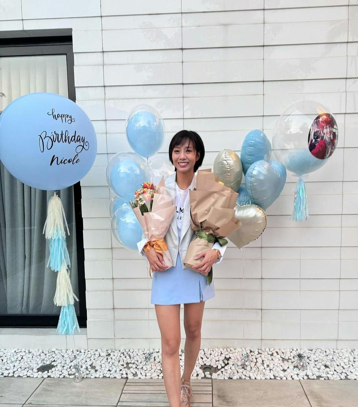 当时还办得颇为隆重,庭院还被布置了一番,放上了蓝色的气球,而胡美贻也身穿蓝色短裙现身,对比起如今她晒出庆祝32岁的照片,地板砖一模一样。