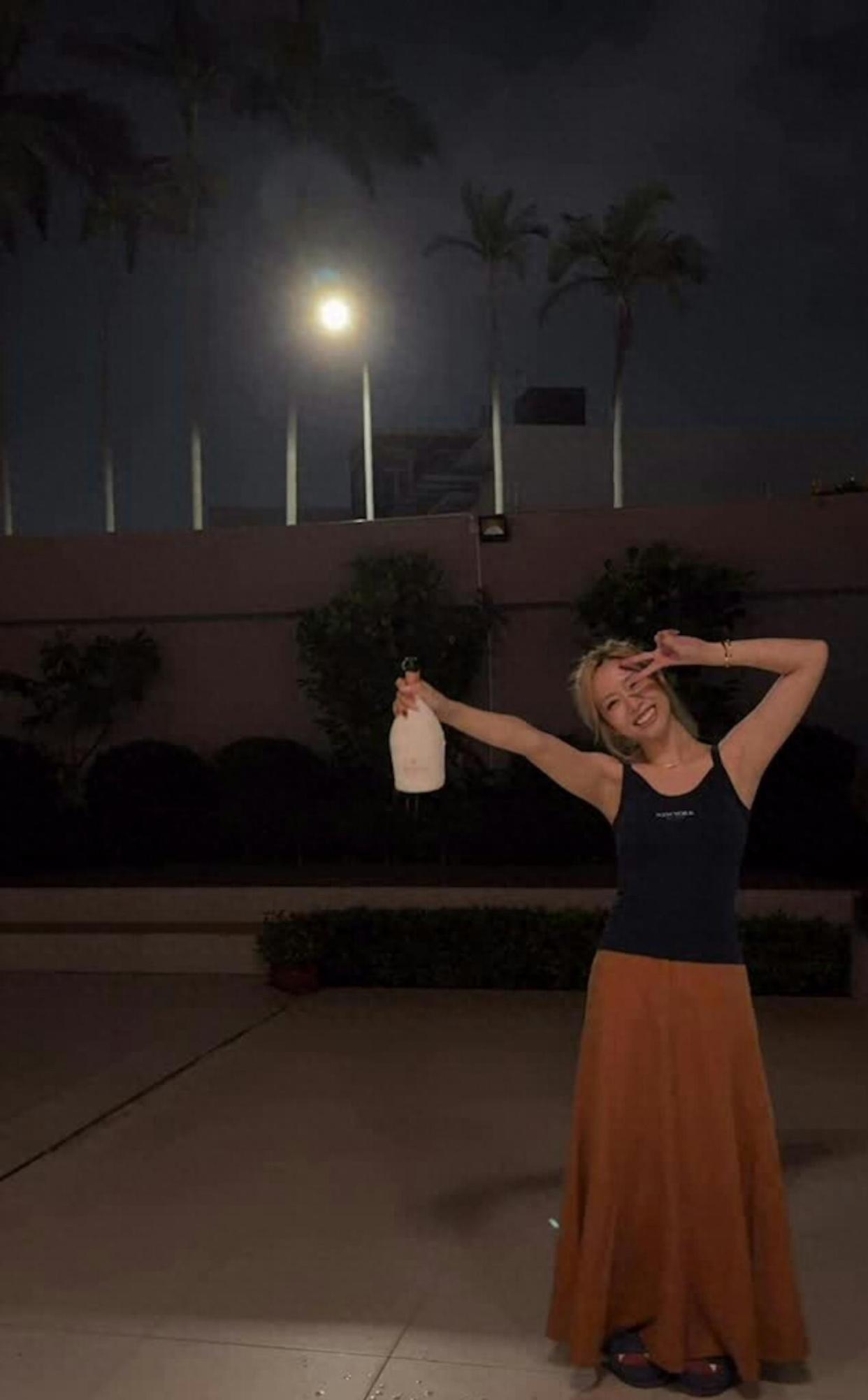 就在前几天她过32岁生日,在社交平台晒了张照片,就她一个人拿着香槟在院子里疯狂摇晃喷洒,笑得那叫一个开心。